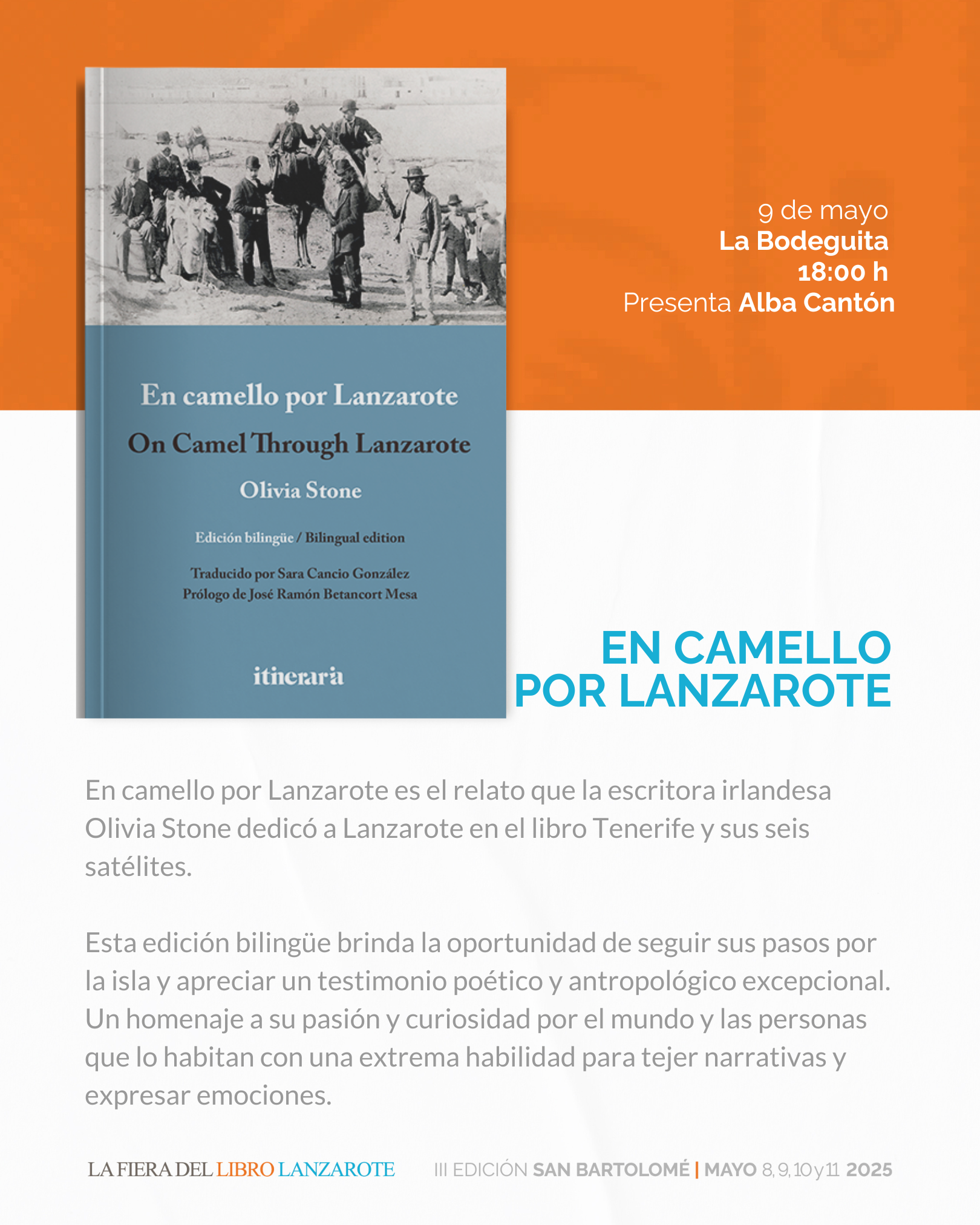 En camello por Lanzarote es un fascinante relato de viajes de la escritora irlandesa Olivia Stone, quien, durante su travesía por las Islas Canarias a finales del siglo XIX, dejó plasmada su experiencia en la obra Tenerife y sus seis satélites considerada como la mejor obra de literatura de viajes sobre Canarias hasta la fecha. Esta edición nos brinda la oportunidad de adentrarnos en su recorrido por Lanzarote y apreciar un testimonio poético y antropológico excepcional. Un homenaje a su pasión y curiosidad por el mundo y las personas que lo habitan y su habilidad para tejer narrativas que nos permiten sentir la experiencia de lo que Olivia Stone vivió en esta isla.