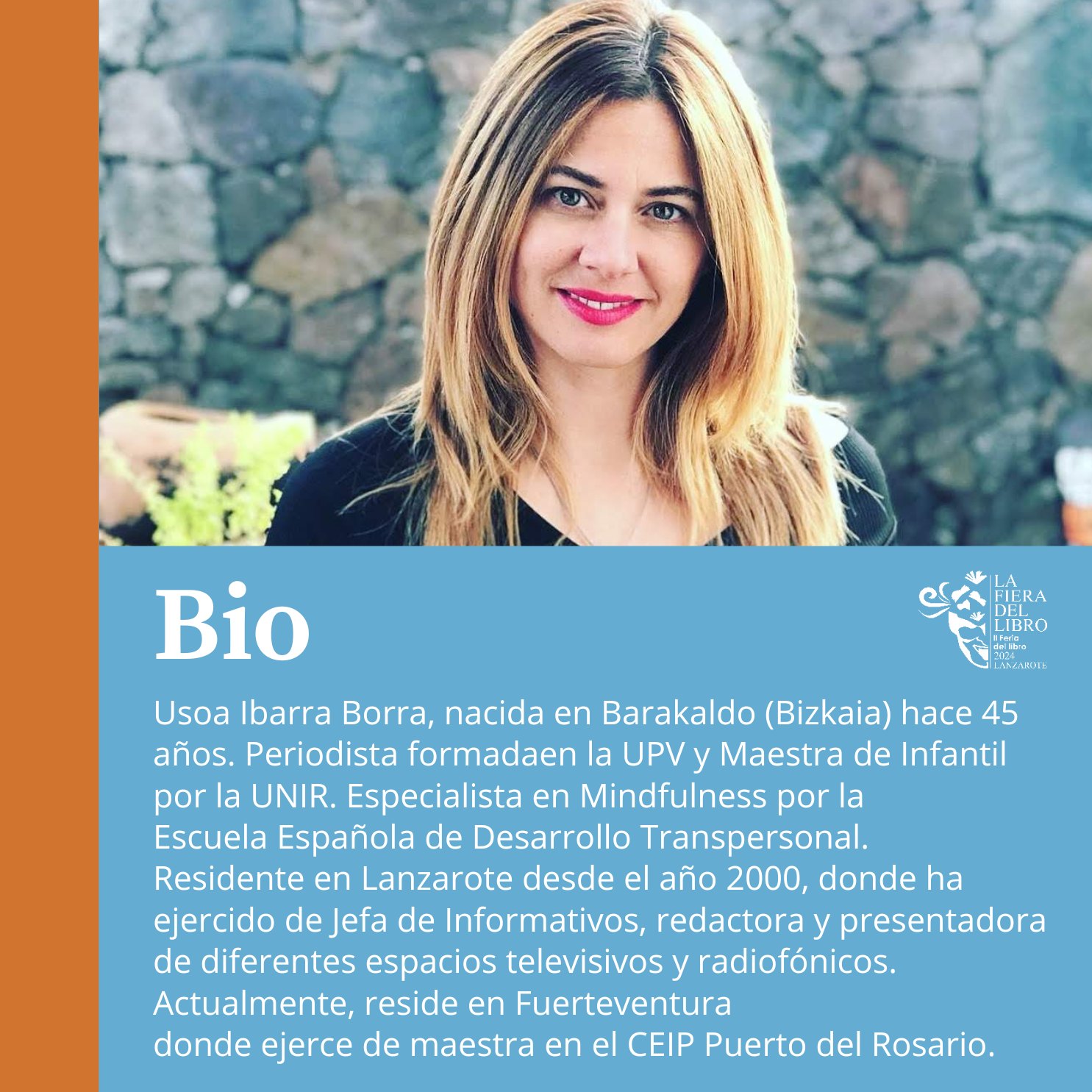 Usoa Ibarra Borra, nacida en Barakaldo (Bizkaia) hace 45 años. Periodista formada en la UPV y Maestra de Infantil por la UNIR. Especialista en Mindfulness por la Escuela Española de Desarrollo Transpersonal. Residente en Lanzarote desde el año 2000, donde ha ejercido de Jefa de Informativos, redactora y presentadora de diferentes espacios televisivos y radiofónicos. Actualmente, reside en Fuerteventura donde ejerce de maestra en el CEIP Puerto del Rosario.